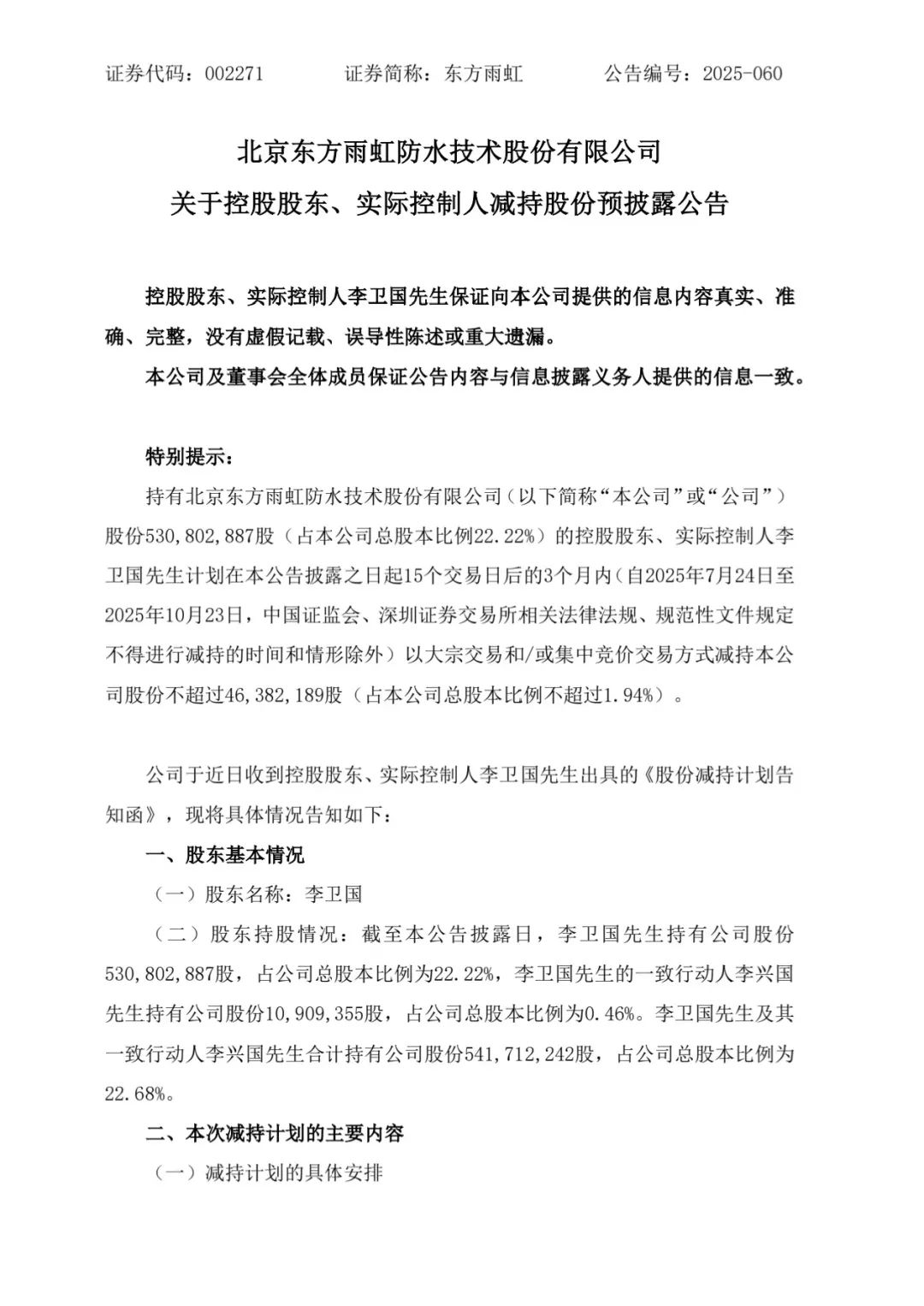 东方雨虹实控人今年7月初抛出减持计划。据7月2日公告,公司控股股东、实际控制人李卫国拟在7月24日至10月23日期间,以大宗交易和/或集中竞价交易方式减持公司股份不超过4638.22万股,占公司总股本比例不超过1.94%。按照最新股价测算,李卫国此次减持套现将在5亿元以上。