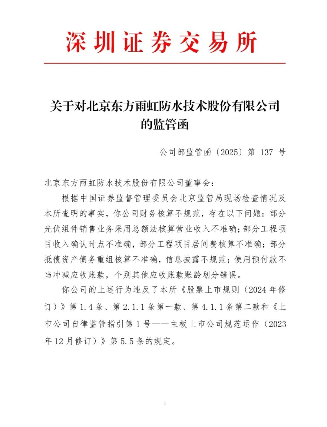 同日,深交所下发监管函(公司部监管函〔2025〕第137号),指出公司违反《股票上市规则》及《规范运作指引》。