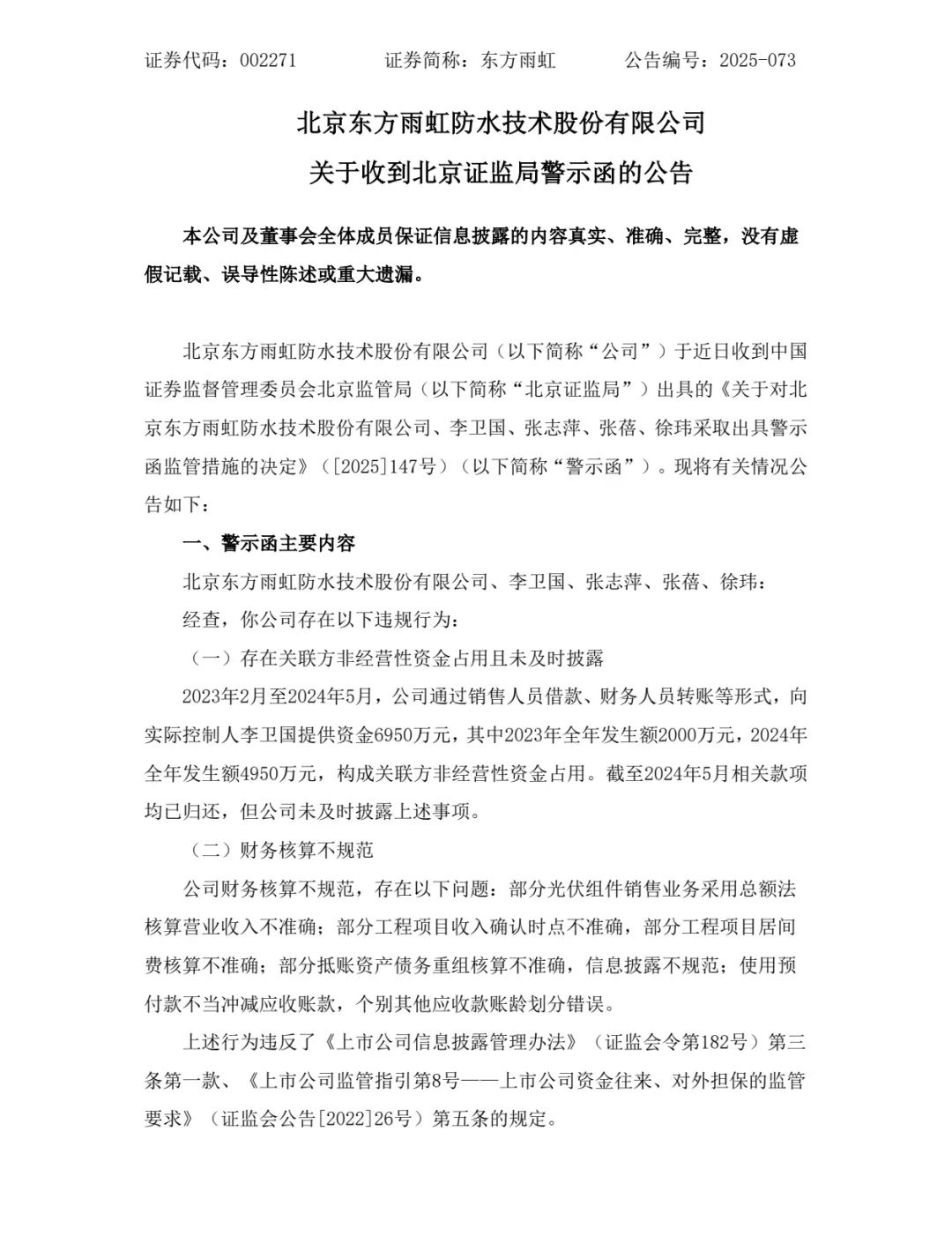 东方雨虹(002271)8月11日发布公告称,公司近日收到中国证券监督管理委员会北京监管局出具的警示函。
